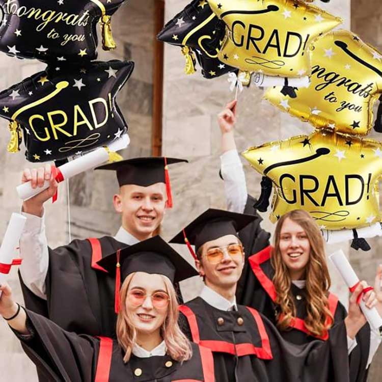 Tá an sraith balún céime seo ar fáil i dtrí dhath, dubh agus ór, chun teagmháil glamour a chur le do chéim. Cuireann balúin caipín céime óir teagmháil fhéile bhreise leis.