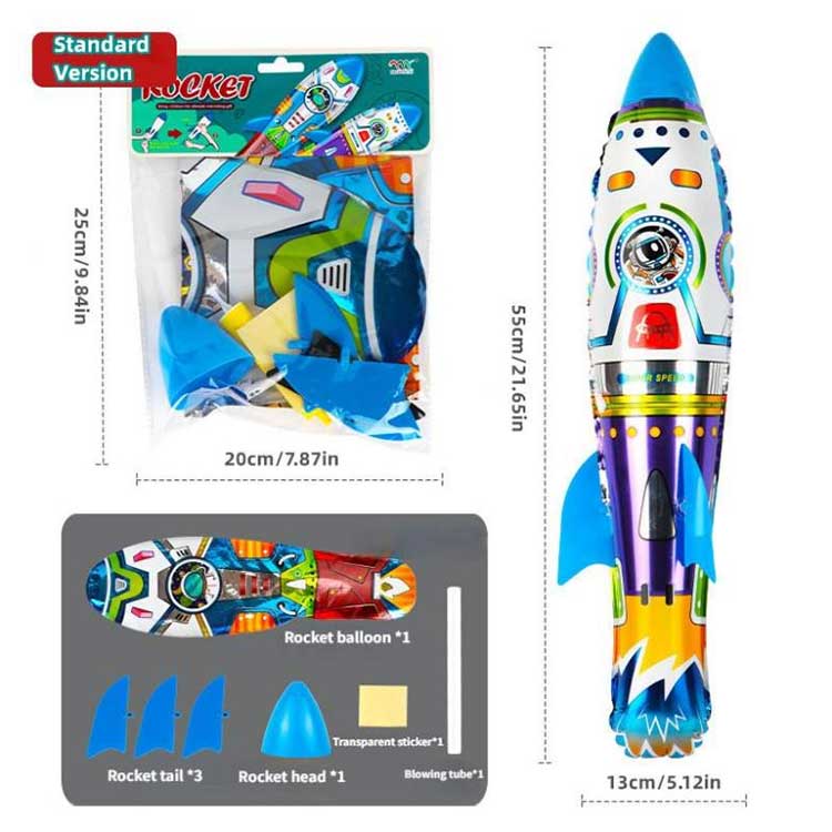 Is é an balún scragall roicéad 3D throwing inséidte bréagán inséidte fada, múnlaithe neamhrialta le patrúin roicéad a bhaineann le clóite ar a dromchla. Ní mór na heití ceann agus eireaball a chur le chéile de láimh, agus ansin suiteáilte tar éis a bheith inflated.Made scragall alúmanaim, nach bhfuil sé briste go héasca agus durable.Foireann le húsáid i spás-téamaí maisiúcháin.