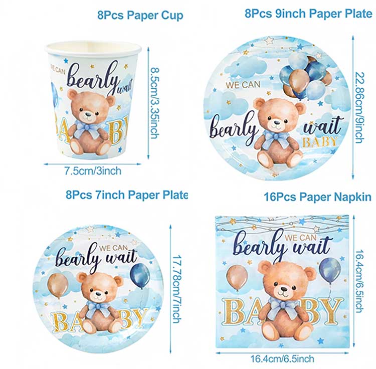 Méid socraithe pláta indiúscartha lá breithe leanbh: Tá an táirge pacáistithe i málaí OPP, ach tá pacáistiú cárta páipéir ar fáil freisin. Is féidir linn an pacáistiú a shaincheapadh de réir riachtanais shonracha an chustaiméara.