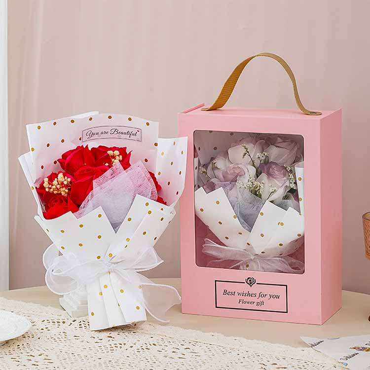 Tá stampáil te, teorainneacha trédhearcacha, agus ábhair cabhraithe ag bosca bronntanais bouquet, rud a d'fhéadfadh na bláthanna a dhéanamh níos cisealta agus ard-deireadh. Is iad na hábhair a úsáidtear ná cairtchlár, lannú agus ábhair atá neamhdhíobhálach don chomhshaol, atá frith-bhrú agus frith-dhífhoirmithe. Le linn aon fhéile, is féidir le custaiméirí a cheannach de réir a gcuid riachtanas, atá an-éifeachtach ó thaobh costais.