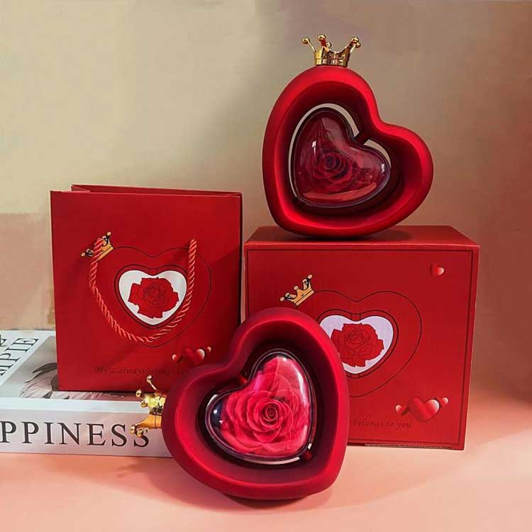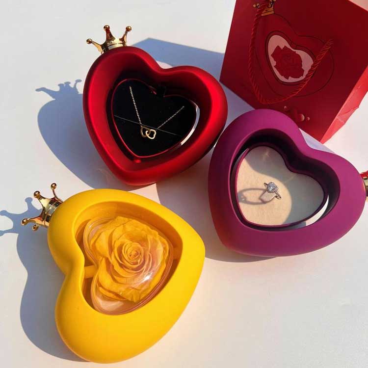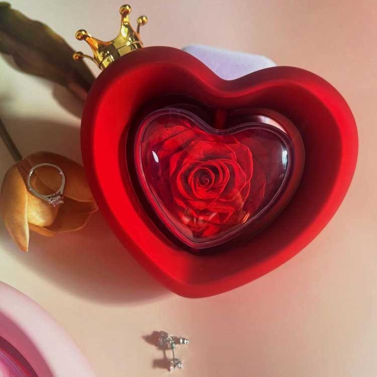Úsáideann Bosca Jewelry Rose Cruth Croí bláthanna leasaithe grád A, a bhfuil a dath agus a uigeacht aitheanta ó bhláthanna úra.