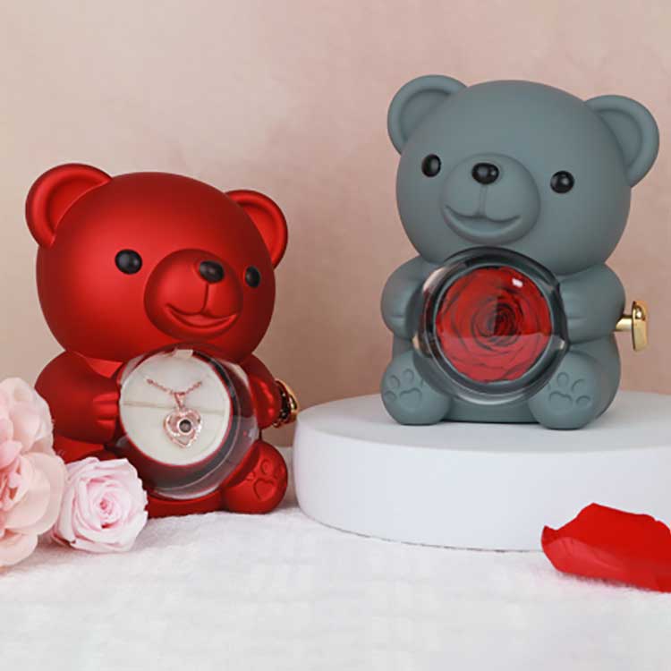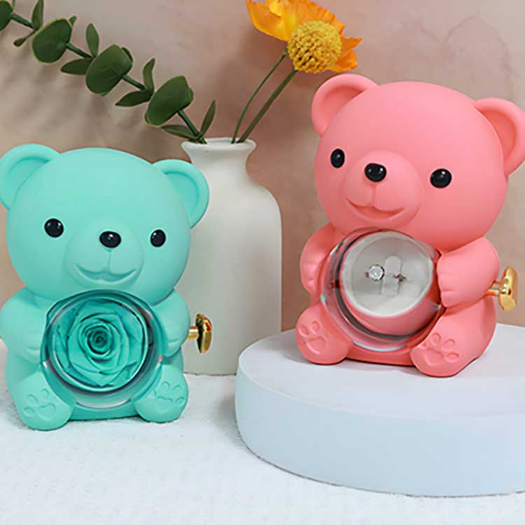 Úsáidtear an Bosca jewelry Hug Bear Rose seo le taispeáint ar dheasc, seilf leabhar, nó tábla cois leapa. Is é an ghné is tarraingtí súl an rós leasaithe sa lár. Nuair a osclaítear an rós, taispeánann sé urrann le haghaidh jewelry, fáinní nó cuimhneacháin a stóráil.