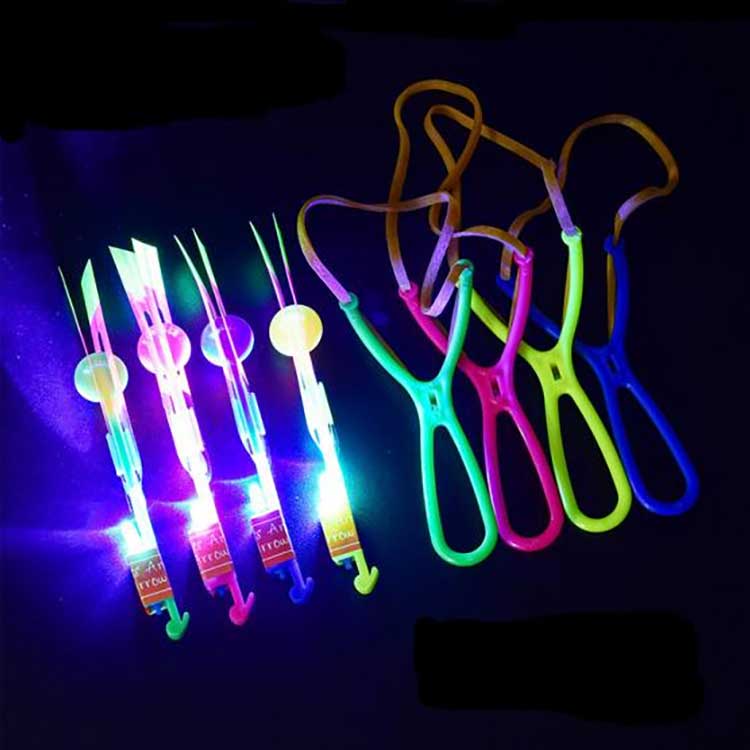 Conas an tSaighead Slingshot Soilsithe faoi stiúir a úsáid: Fuair an dá shaighead i gcruth bíseach. Coinnigh an seafta le do lámh chlé, tarraing ar ais é le do lámh dheas, agus scaoil le do chlé. Téann an tsaighead suas thart ar 20 méadar. Is í an ghné shainiúil atá aige ná a rothlú mall agus a shliocht. Comhcheangailte le soilse stiúir ionsuite. Tá na soilse fós ar siúl, níl siad ach ag athrú dathanna.
