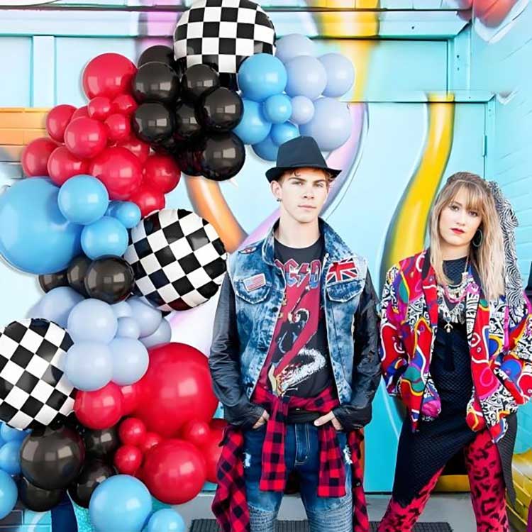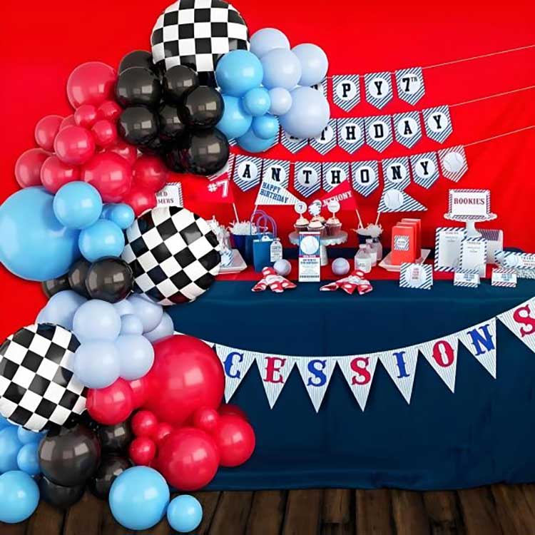 Tá 88 comhpháirt sa trealamh maisiúcháin áirse balún téama rásaíochta. Áiríonn sé 80 balún laitéis, 6 balún scragall, 1 slabhra balún, agus 1 phonc gliú.