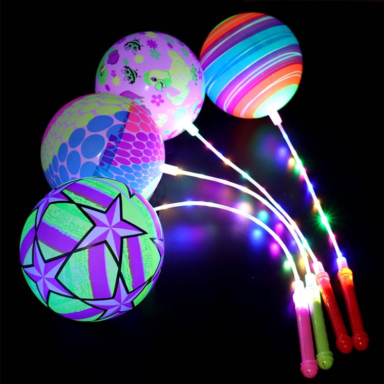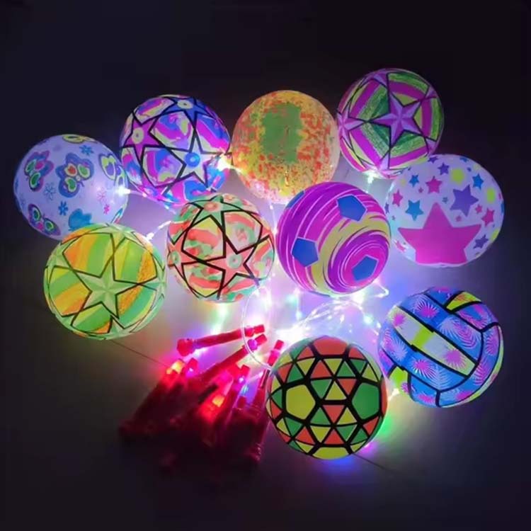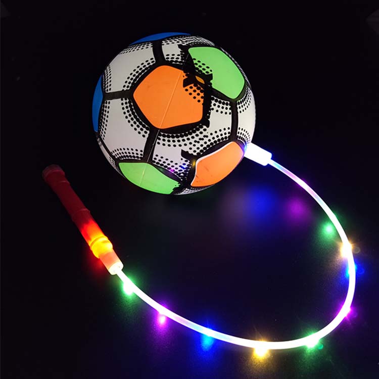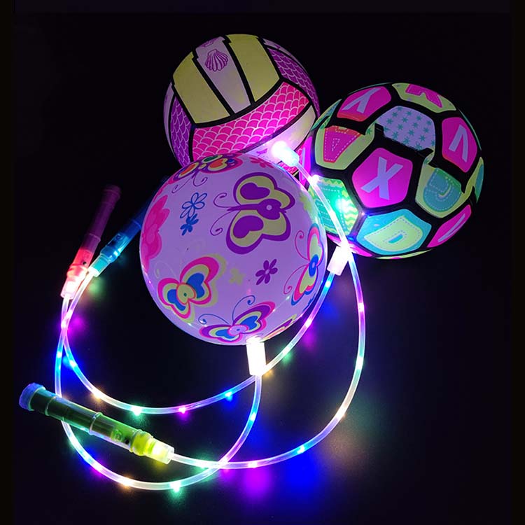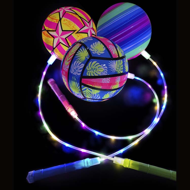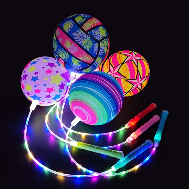 Tá liathróidí preabadh teaghrán le soilse LED liathróid phreabadh ceangailte le teaghrán, le soilse LED leabaithe taobh istigh nó ar an dromchla. Nuair a bhíonn siad iompaithe ar aghaidh, scaoileann na soilse soilse ildaite nuair a phreabann tú, a luann tú, nó nuair a choinníonn tú é. Tá na soilse seo níos sofheicthe i dtimpeallachtaí dorcha.